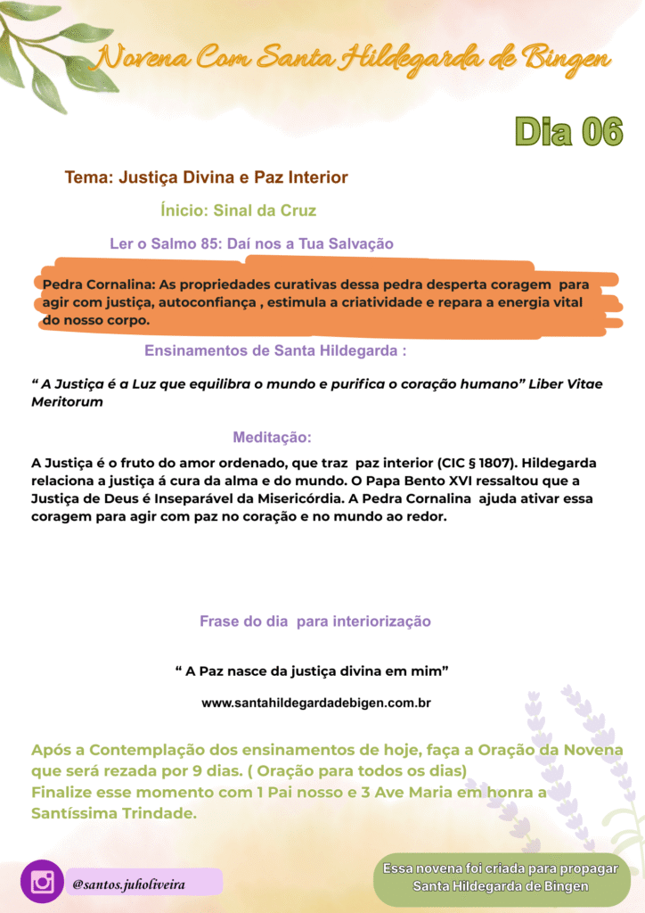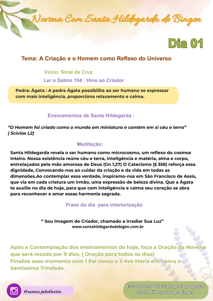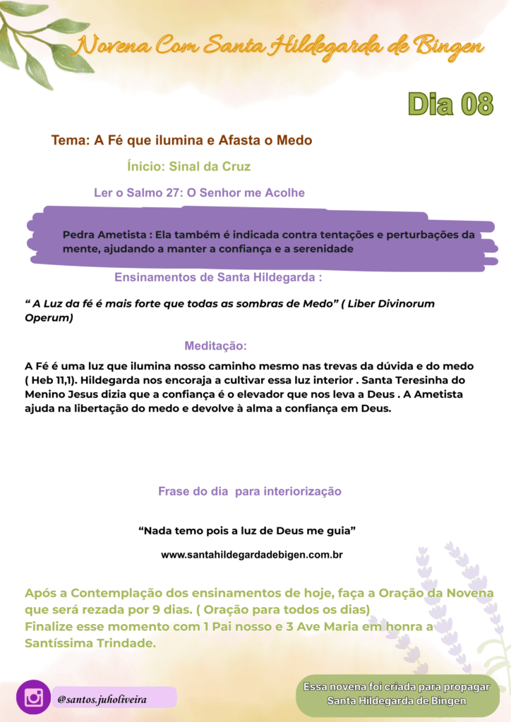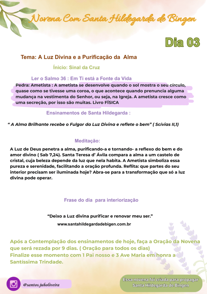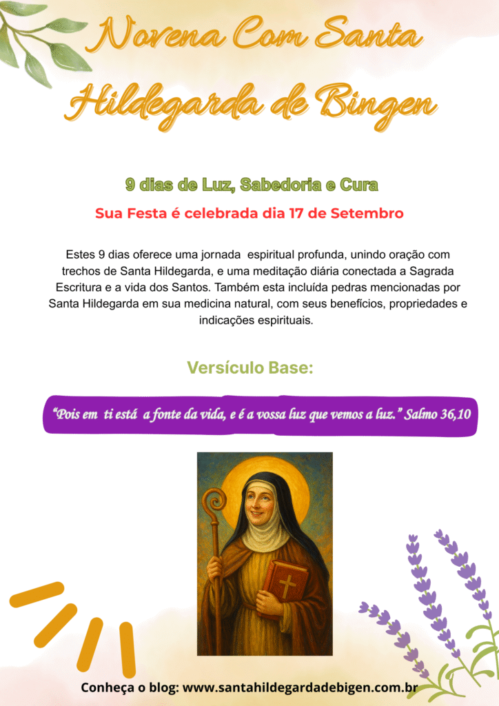 Rezar esta novena é como permitir que a luz da criação divina aqueça o coração, trazendo equilíbrio, serenidade e renovando a confiança na providência de Deus. Que cada oração fortaleça a alma, desperte a gratidão e inspire a viver com coragem e alegria, seguindo os ensinamentos de Santa Hildegarda.