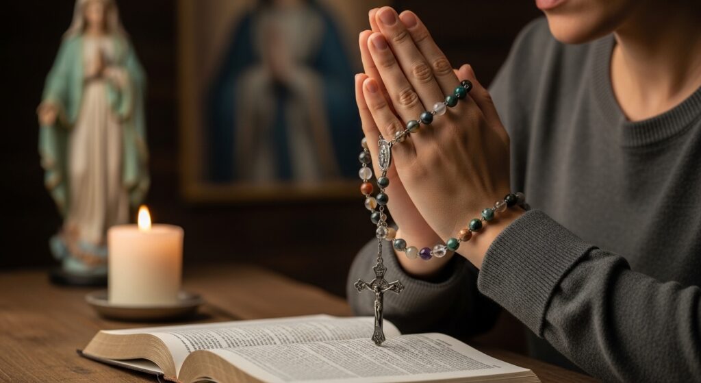 Rezar diariamente o terço em pedras pode se tornar um sinal concreto do compromisso espiritual da mulher com Deus. A repetição das Ave-Marias, unida à solidez das contas, recorda que a fé não se apoia em sentimentos passageiros, mas em uma decisão firme de seguir Cristo.